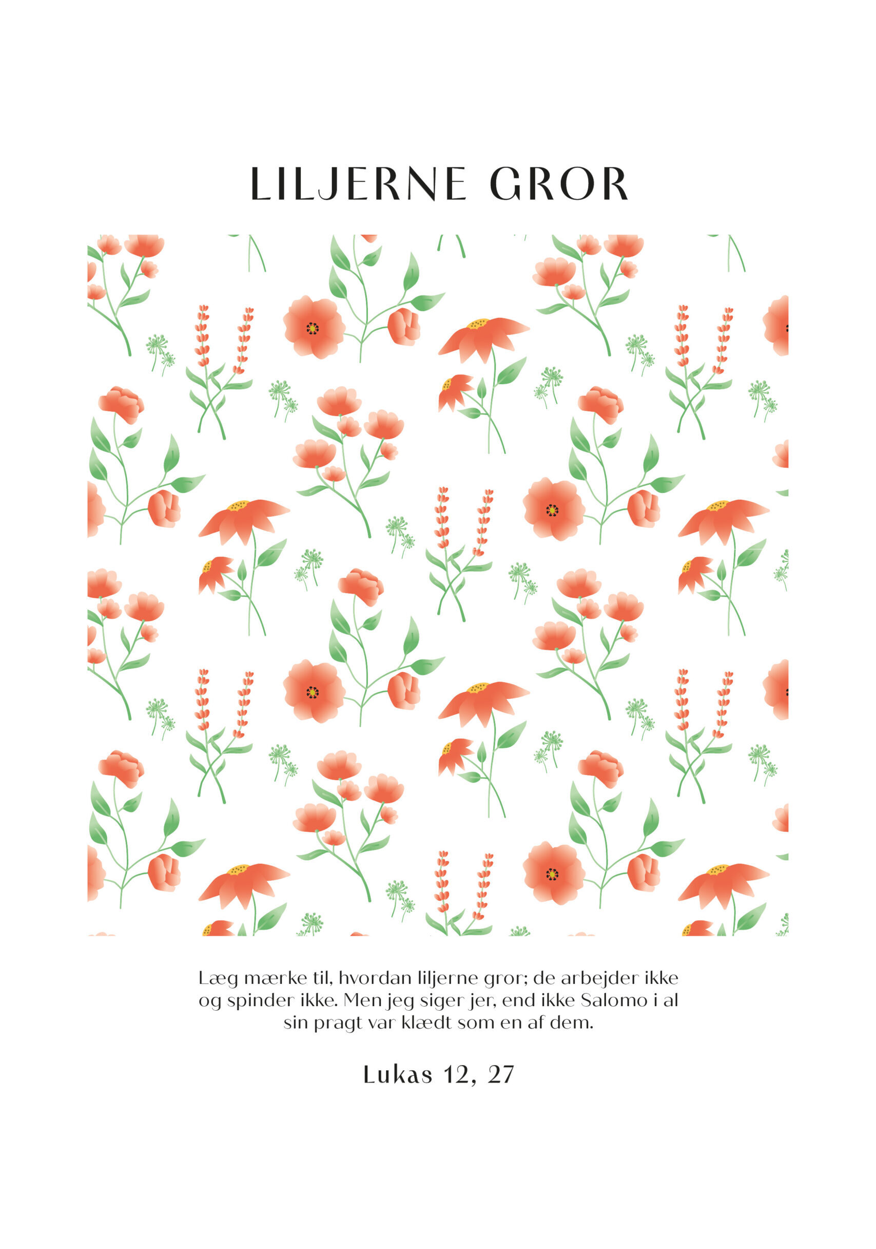 Plakat med røde blomster og et bibelvers, som minder os om, at Gud ser os og har styr på det hele vores liv – ligesom han har styr på blomsterne og græsset.